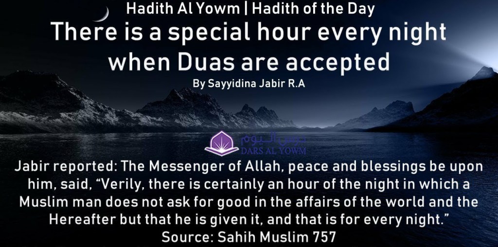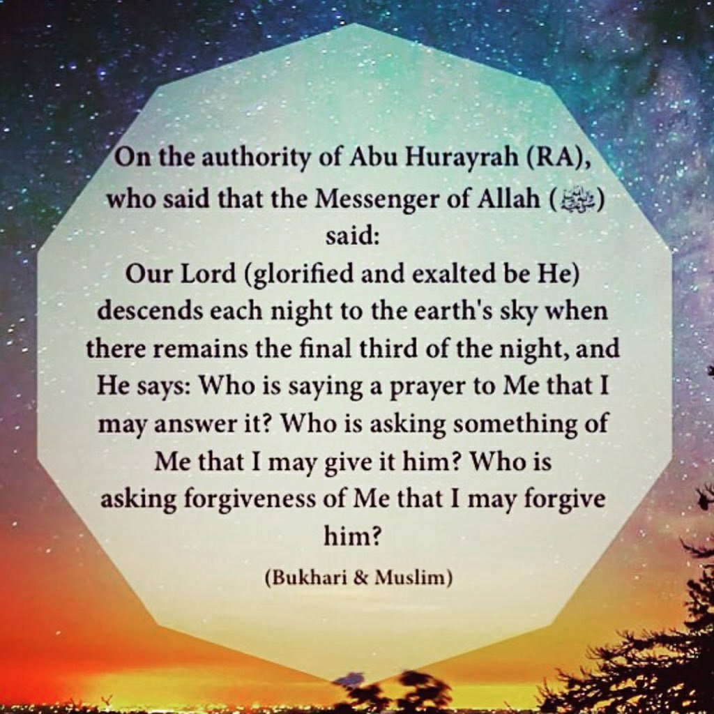 - Abu Hurairah reports that the Messenger of Allah (saws) said: “Our Lord Descends to the lowest heaven during the last third of the night, inquiring: `Who will call on Me so that I may respond to him? Who is asking something of Me so I may give it to him? Who is asking for My forgiveness so I may forgive him?” [Bukhari and Muslim.]