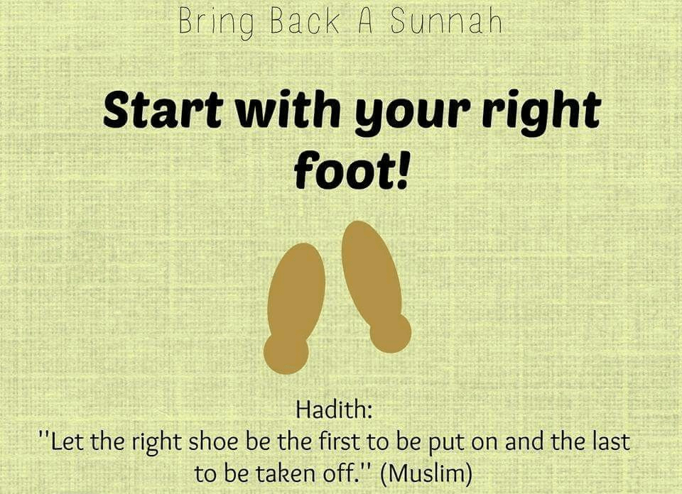“If you want to put on your shoes, put on the right shoe first; and if you want to take them off, take the left one first. Let the right shoe be the first to be put on and the last to be taken off” (Bukhari&Muslim)