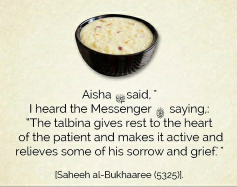 Aisha (r) used to recommend at-Talbina for the sick and for such a person as grieved over a dead person. She used to say, “I heard Allah’s Messenger (ﷺ) saying, ‘at-Talbina gives rest to the heart of the patient and makes it active and relieves some of his sorrow and grief.'”