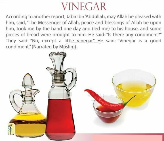 Our beloved Nabi Muhammad (peace be upon him) was reported to have once remarked that vinegar was the seasoning of all the prophets who came before him. Our beloved Nabi Muhammad (peace be upon him) liked vinegar. Jabir (r) narrated, “The Messenger of Allah, peace be upon him, took me one day with him to his house. He was served some bread. He asked: ‘Is there any dip?’ They replied ‘No, only some vinegar.’ He said, ‘Vinegar is a good dip.’ Jabir (r) used to say, “I have loved vinegar since I heard it from Allah’s beloved Nabi “. Naf’a said, “I have loved vinegar since I heard it from Jabir.” [Muslim, Abu Dawud, Nasa’i].